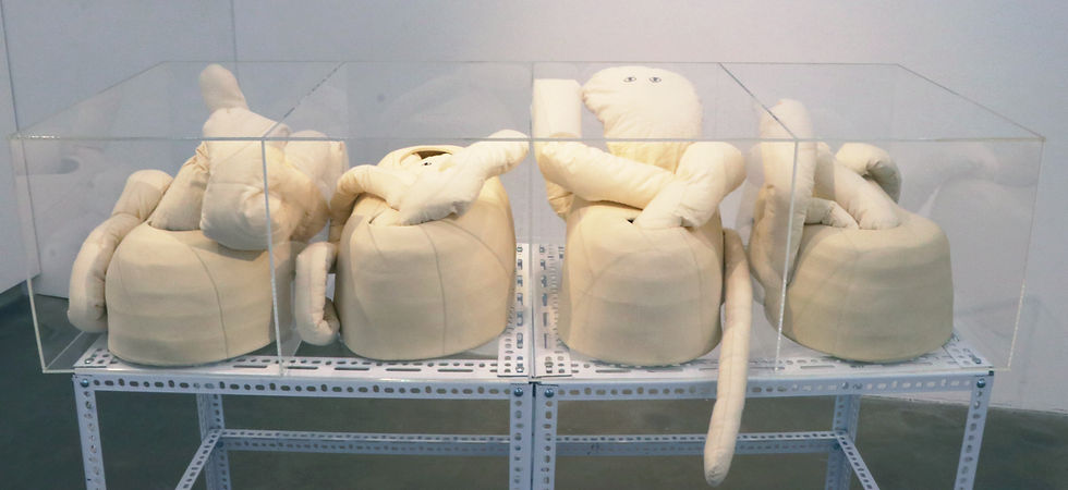系列創作核心 作為一個體游離於空間中,這個空間的定義是實體的?或是自身與外在一切的藩籬?在面對外力的嵌制與壓迫時,一方面生長成符合框架的樣貌,另一方面則是嘗試突破困境與限制,雙向拉扯中所形成的是一種混沌曖昧的狀態,採用陶土與布料纖維這兩種截然不同的媒材形式,形塑一個內外相互牽制的狀態。這個系列主要分為兩件作品,一件是我透過居住空間壓縮做一個概念,延伸出來的城市語言,在資本主義之下所形成時空壓縮之現象,遙想未來都市空間分配的困境和隱憂,居住在如同膠囊旅館般的艙房裡,最終被冰冷的壁面所限制、壓縮,生物如同一個繭型的個體,透過微小的洞口去窺探世界。 另一件為此空間壓縮總體現象的橫面剖析,結構是不穩定且開放的,試圖讓雕塑軟性的部分成為一種語言結構,使意識延伸在空間之中。 創作動機 此系列作品主要以我的生活經驗去做出發,是大學時期對空間轉換的階段性反思,居住在都市人口密集之處,我們所能使用的空間比原先更少,感受到生活的空間被壓縮,一方面是觀察現今膠囊旅館的形態,發現此種旅店形式就是在有限空間內不斷切割與重置,最後人類所能使用的居住所變成一個個大小相同的空間,創作者讓媒材作為想像空間的載體,利用身體勞動揉和兩種媒材,產出一種限制狀態與一種被限制下的模擬樣貌,將起初的創作理念放大至自我與外界的關係,亦是社會與群體間變動中的平衡狀態。 身處在一個空間轉換階段與高密度壓縮的時空狀態,創作者在都市環境做一種自身的談話,思考離開學院體制後所形成的衝擊與社會,身為一個藝術創作者如何將自己置入社會,這是必然面臨的問題,我選擇從觀察都市的空間變化開始,慢慢延伸至群體性議題,進而發展屬於自己的創作脈絡,在營造空間的狀況下,並無將作品放大到與觀者相近的尺度,目的在消泯觀者的存在,置於旁觀視角,形成觀看的單向性、都市冷漠的觀看模式。